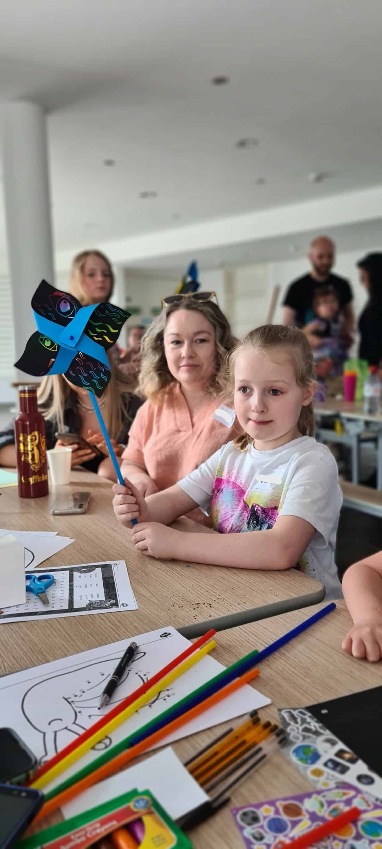 A girl is showing her paper windmill