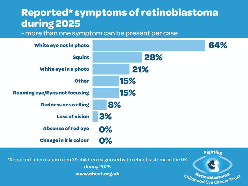 A white glow in the eye remains the most common symptom overall. This year more than the 10-year average noticed a white glow in the child’s eye, and slightly fewer than average noticed it in a photograph. This is significant because the glow is likely to be noticeable earlier in a photo than with the naked eye. A new squint is still the second-most important symptom, but slightly less families than average reported this as a symptom in 2025.